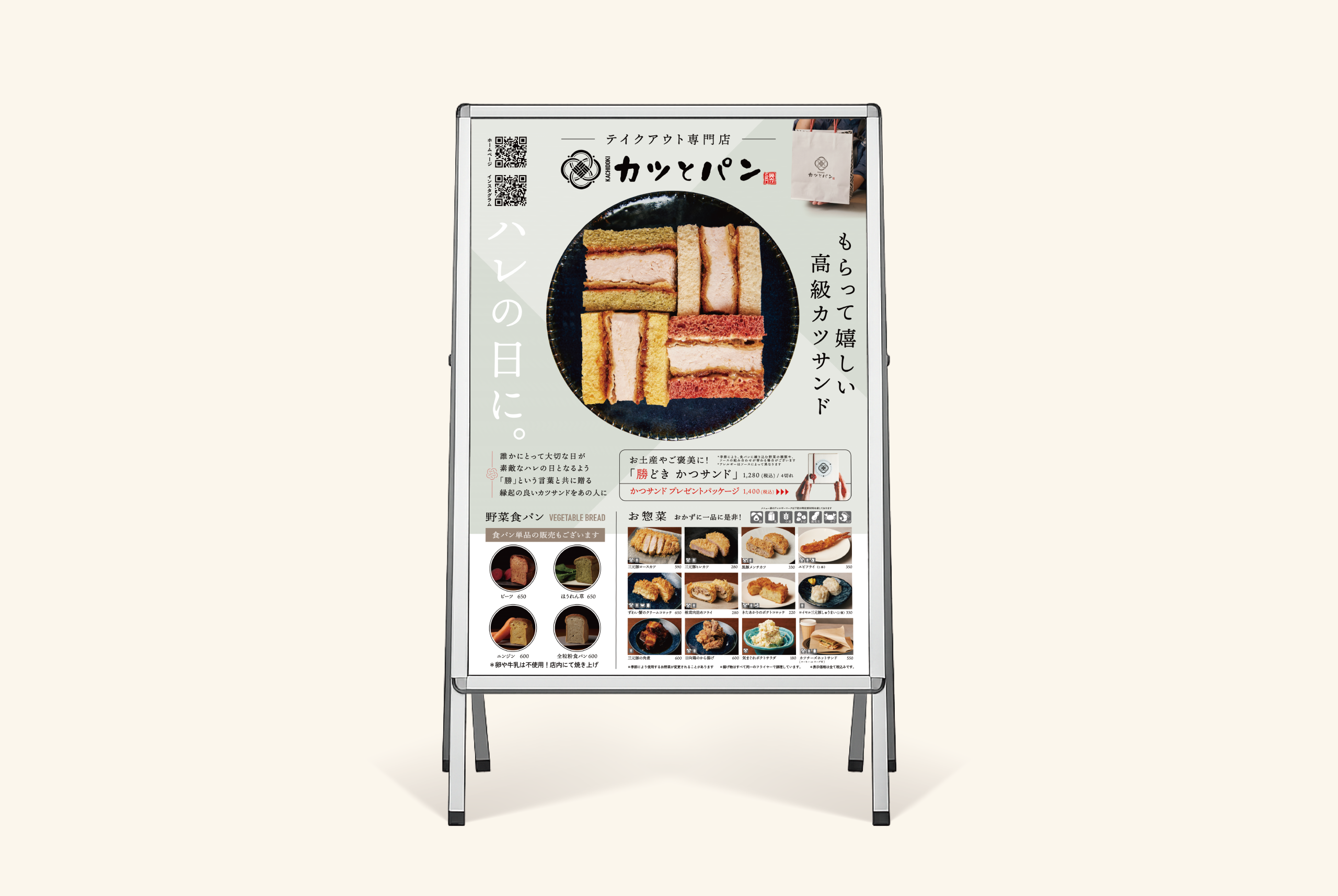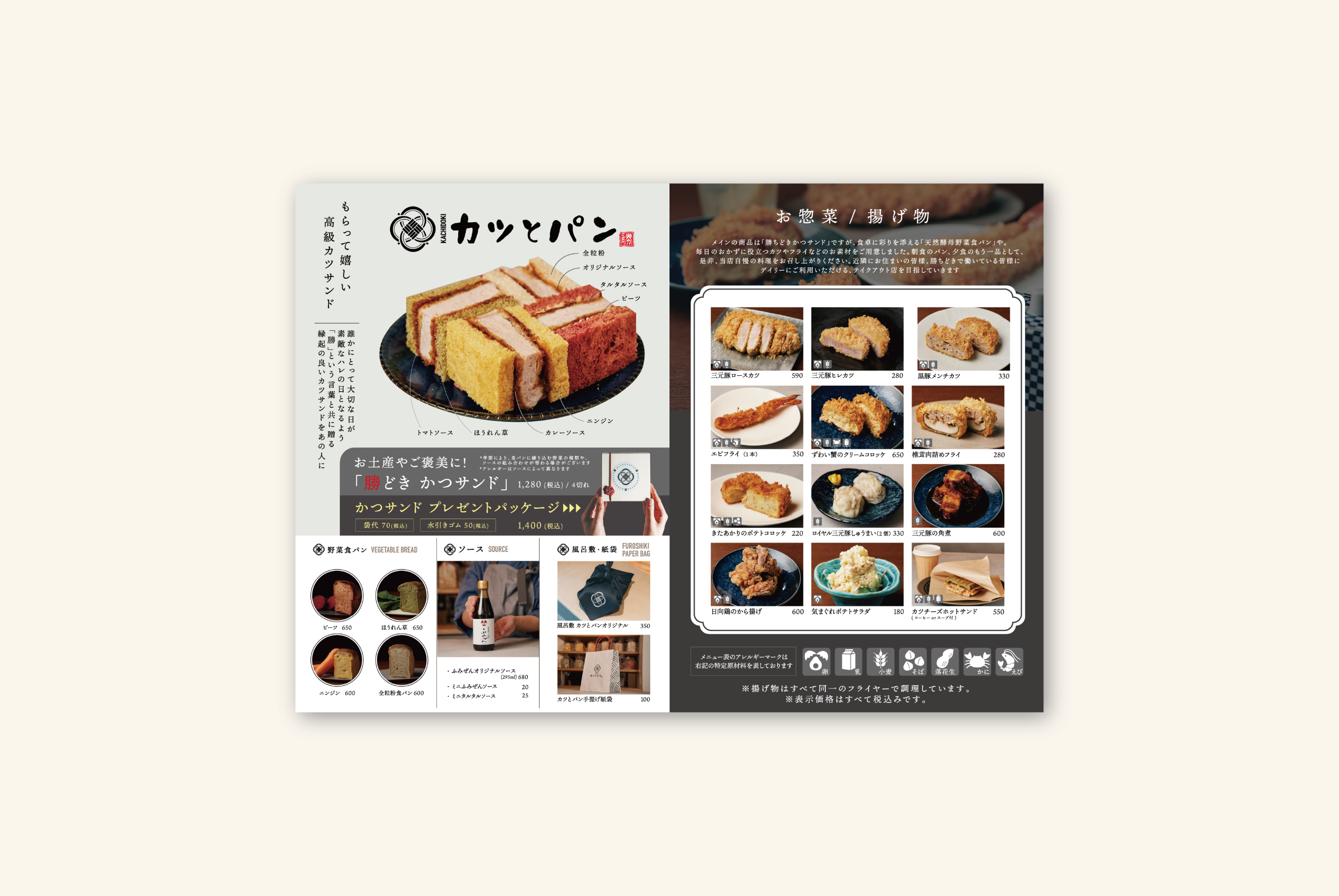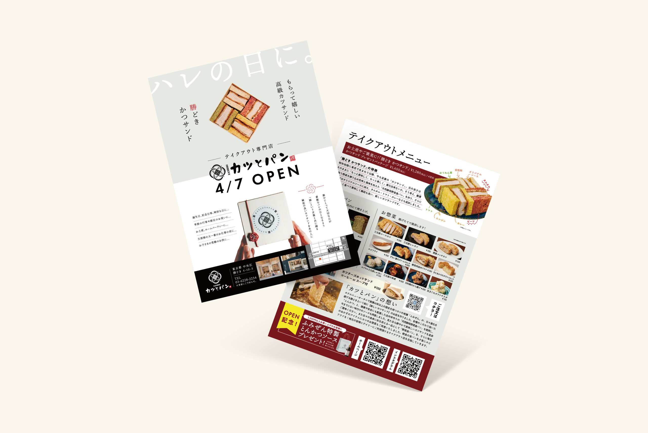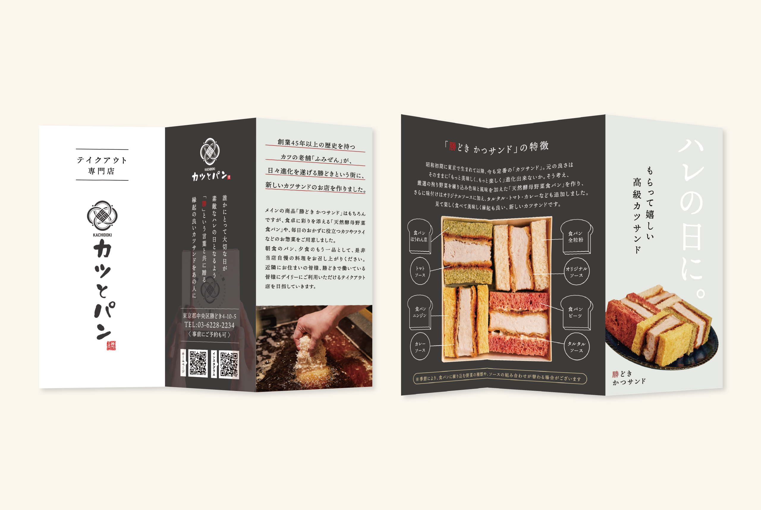 ・店名:カツサンドに必要な素材に因み、また思い出してもらえるようにとシンプルに「カツとパン」としました。ロゴ:「カツサンド」「縁結び」「人の繋がり」を縁起の良い日本古来の「水引き」のイメージの中に融合させ、文字は親しみがありながらもどこか可愛らしく温かみのある手書き文字としてあしらいました。