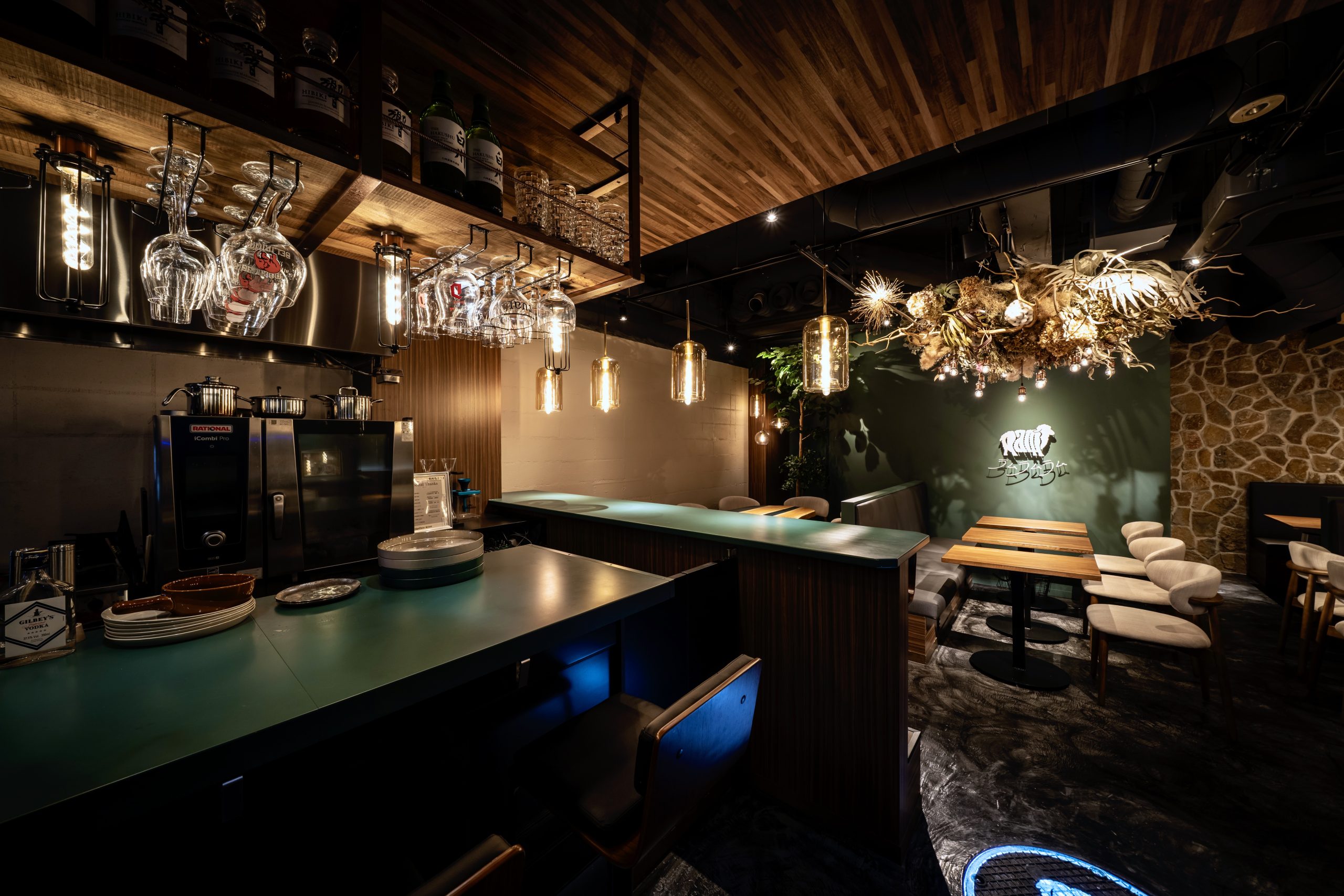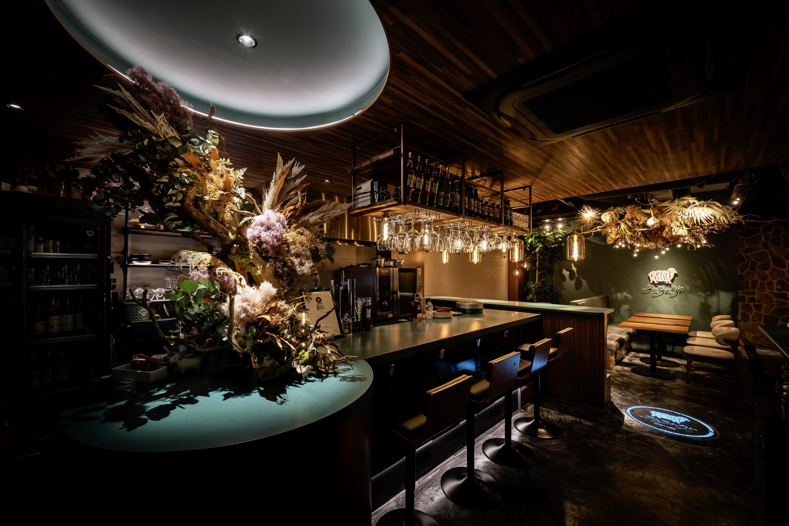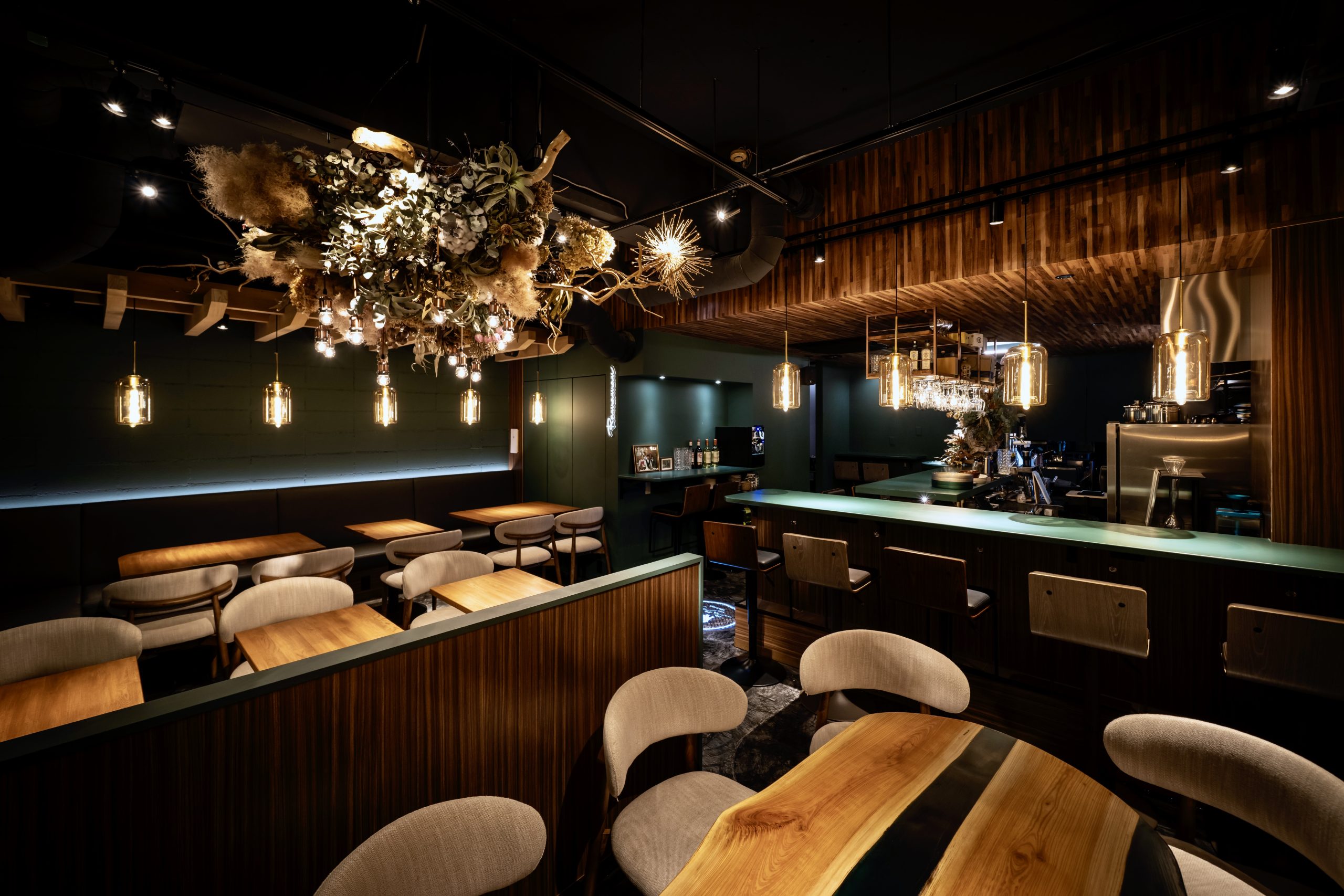 階段を降り、店の扉を開くと目に飛び込んでくるのは、シャビー、シックでありながらラグジュアリーな空間。濃いグリーンをアクセントに、木目調と白でアレンジされた暗めの店内は、ほどよく落ち着き、清楚に感じさせながらも色気のある空間となっております。